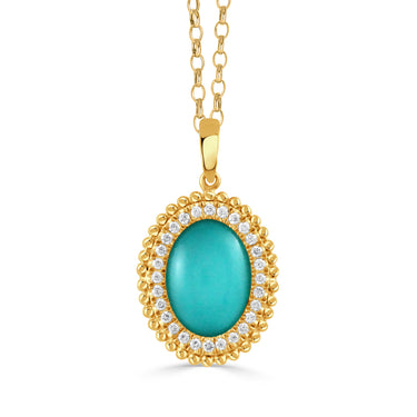 18KY Oval Turquoise Apatite Stone Diamond Halo Pendant Necklace