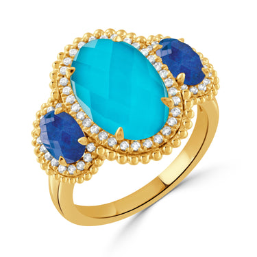 18KY Turquoise Center with Lapis Sides Diamond Ring