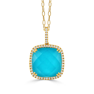 This elegant pendant necklace showcases a stunning 9.70-carat cushion-cut turquoise apatite stone, complemented by a shimmering diamond halo featuring 51 round diamonds totaling 0.21 carats. Crafted in lustrous 18-karat yellow gold, the design is enhanced with a clear quartz overlay that adds depth and brilliance. A timeless piece that effortlessly elevates any ensemble with refined sophistication and natural beauty.