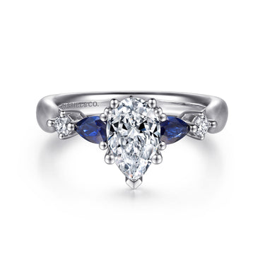 Introducing the epitome of elegance and personal expression: the Platinum Pear Shape Five Stone Sapphire and Diamond Engagement Ring. This exquisite semi-mount masterpiece is meticulously crafted to complement your chosen center stone, transforming it into a unique symbol of your love story. The lustrous platinum band is adorned with a harmonious blend of radiant sapphires and dazzling diamonds, each carefully selected to enhance the brilliance of your preferred diamond or gemstone. The pear-shaped design adds a touch of sophistication, while the five-stone arrangement creates a captivating display of luxury and refinement. Celebrate your individuality with this stunning engagement ring, designed to highlight your personal choice of center stone. Whether you envision a classic diamond or a vibrant gemstone, this ring provides the perfect canvas for your bespoke creation, ensuring an engagement ring that is as unique and timeless as your love.