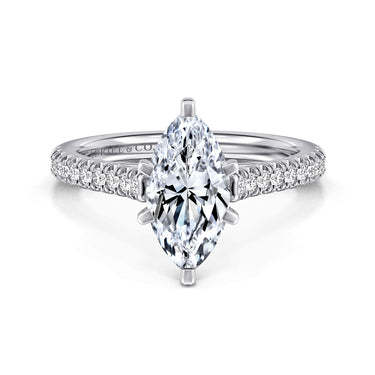 Introducing the epitome of elegance and personal expression: the 14K White Gold Marquise Shape Diamond Engagement Ring. This exquisite semi-mount setting is designed to cradle your chosen diamond or gemstone in a marquise embrace, celebrating both tradition and individuality. Meticulously crafted from lustrous 14K white gold, its delicate band is adorned with a shimmering constellation of pave-set diamonds, enhancing the brilliance of the center stone you select. This ring serves as a sophisticated canvas, inviting you to crown it with a diamond or gemstone that reflects your unique love story. Embrace the opportunity to create a masterpiece of your own, where luxury meets personal artistry.