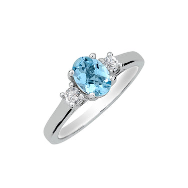 Crafted in lustrous sterling silver, this elegant ring features a stunning 7x5 oval aquamarine as its centerpiece, complemented by two brilliant round diamonds totaling 0.16 carats. A refined choice for those who appreciate timeless sophistication and natural gemstone beauty.