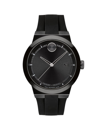 Movado BOLD Fusion, 42mm black ion-plated stainless steel case & black ceramic bezel with a black-toned dial on black silicone strap.