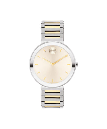 Refining sleek, contemporary style in an ultra-thin design. The 34mm case of this sophisticated watch is only 6.5mm thick, creating a super sleek silhouette. This two-tone timepiece is crafted from stainless steel and yellow gold ion-plated stainless steel. A matching Y-link bracelet and chalk dial with yellow gold-toned accents complete the design.