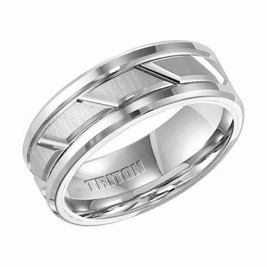 8mm White Tungsten Flat Comfort Fit Band with Horizontal and Diagonal Grooves